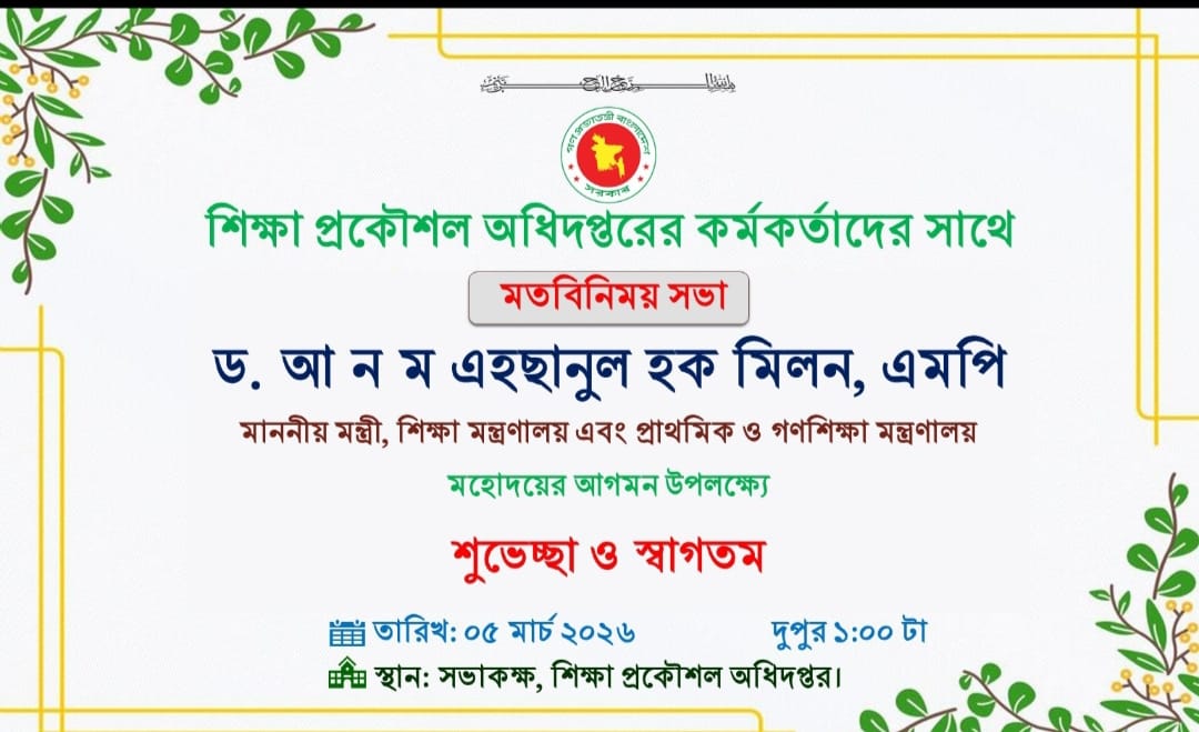 ড. আ ন ম এহছানুল হক মিলন, এমপি-এঁর মাননীয় মন্ত্রী শিক্ষা মন্ত্রণালয় এবং প্রাথমিক ও গণশিক্ষা মন্ত্রণালয় শিক্ষা প্রকৌশল অধিদপ্তরের কর্মকর্তাগের সাথে মতবিনিময় (05.03.2025)।
